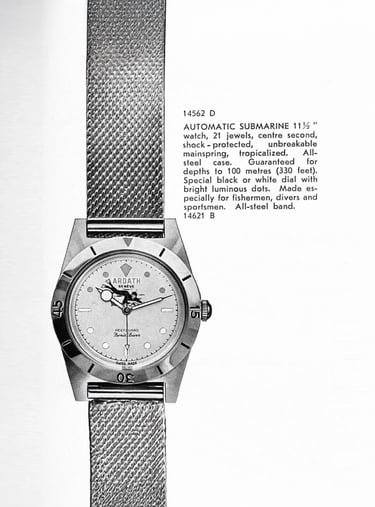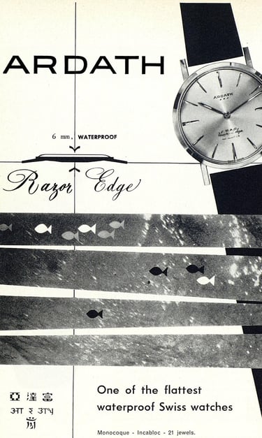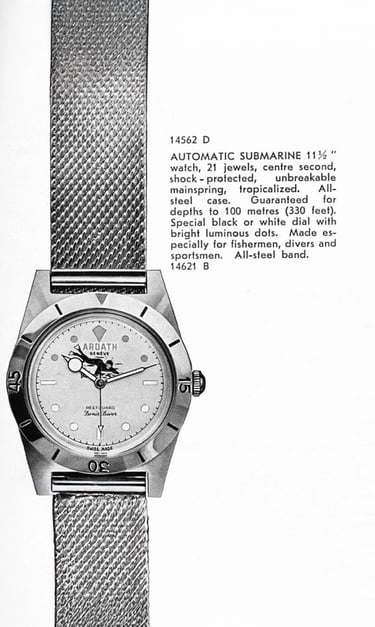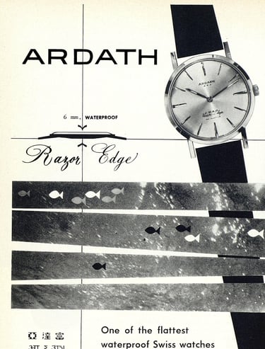 These included the "Convertible" with its interchangeable cases and awarded to Miss Europe in 1970, the "Tyematcher" and "Versatile" models offering interchangeable dials, the ultra-slim waterproof "Razor Edge," and the "Reef Guard", the first watch ever to feature the iconic "scuba dude" dial motif, a design element that would later be embraced by numerous other watchmakers. Most notably, Ardath launched the "Long Distance" model, one of the pioneering dual time watches in horological history. This groundbreaking timepiece continues to stand as the crown jewel of the Ardath collection, exemplifying the brand's enduring commitment to horological innovation and excellence.