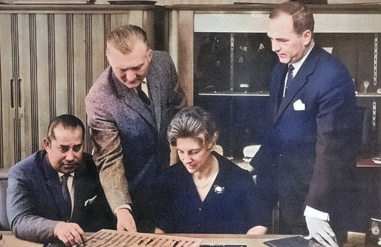 Mr Chandu Saswani (Ardath agent for Gibraltar), Mr Enrico Mottironi, Mrs Paulette Dreyfus, Mr Freddy Zaugg, 1966, Geneva